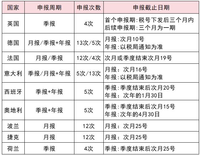 申报周期:不同国家有不同的申报周期。例如,英国、德国、法国、意大利和西班牙都有各自的申报截止日期,通常为每月或每季度的10日前。