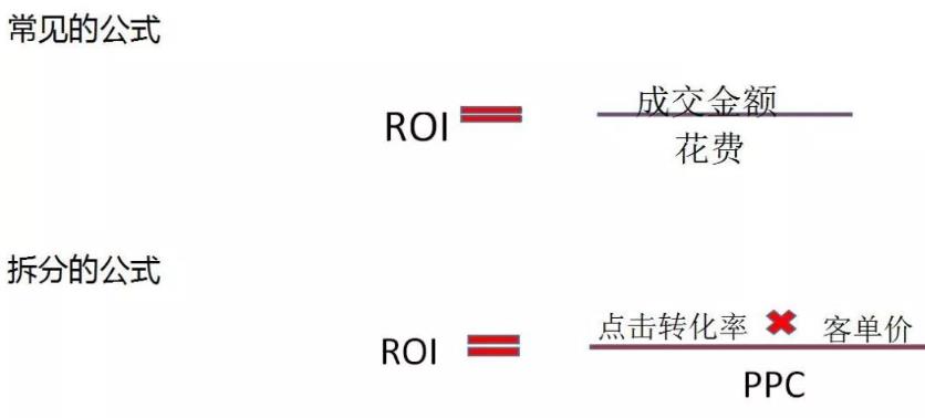 而电商的销售金额=点击*转化率*客单价,花费=点击*平均点击花费。