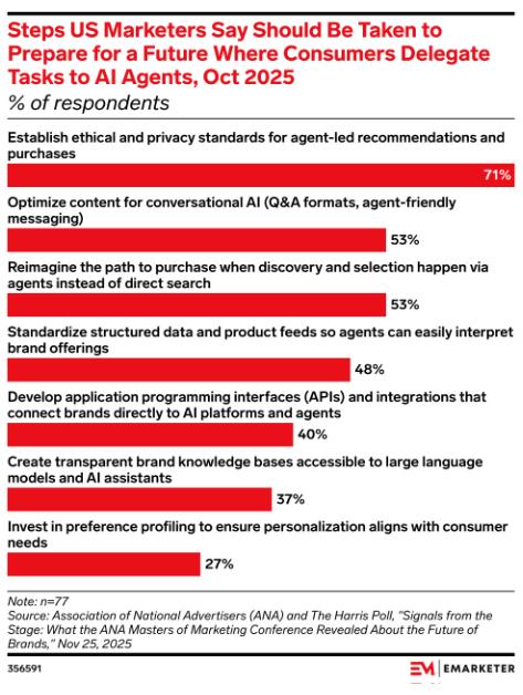 关键统计: 根据国家广告协会和盖洛普民意调查公司在2025年10月进行的一项调查,71%的美国营销商表示,在消费者将任务委托给AI代理的未来中,建立道德和隐私标准应是首要任务。